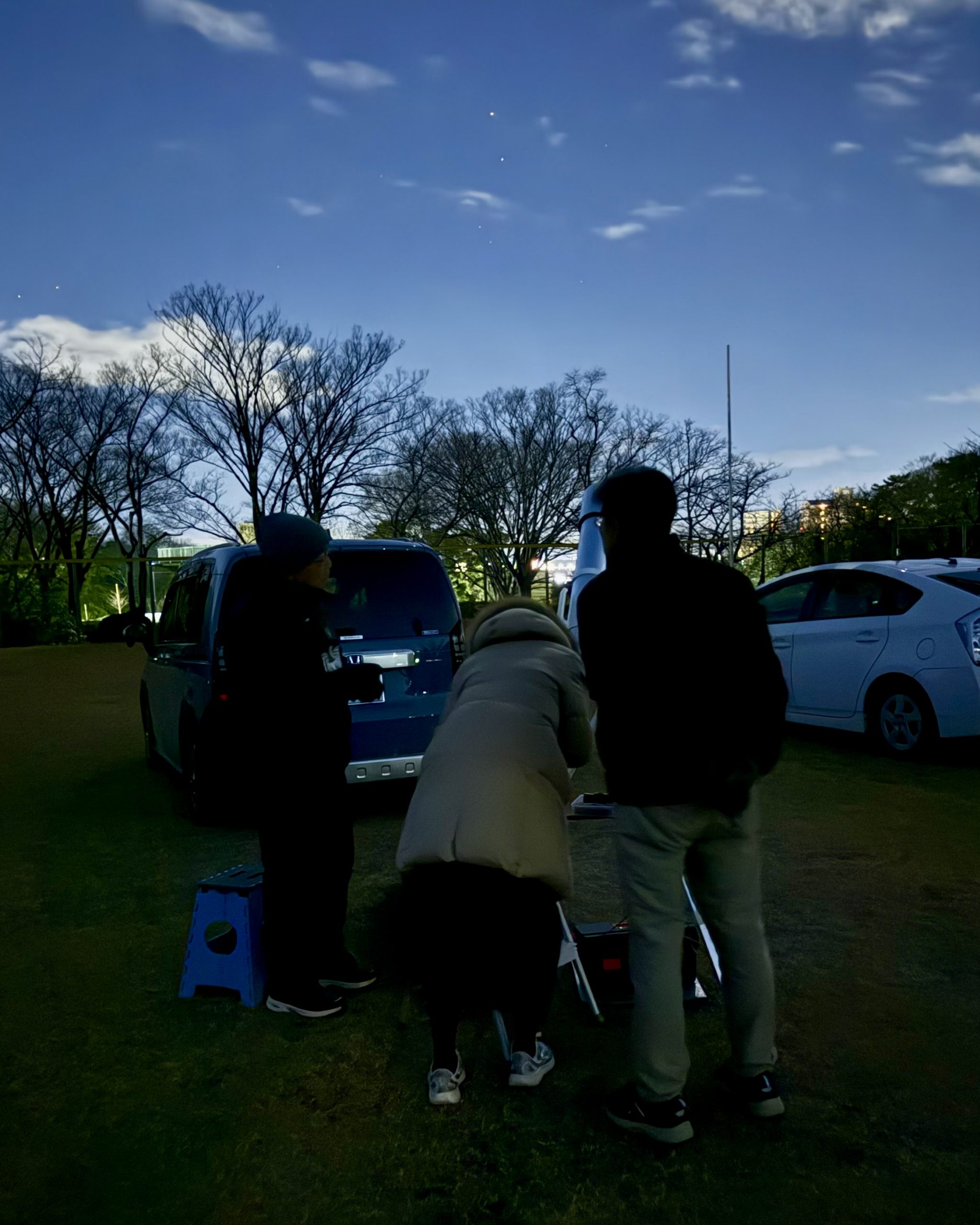 講師から今夜観測できる冬の星座等の説明後のあと、野球場へ移動し天体望遠鏡3台で天体観測を行いました。
